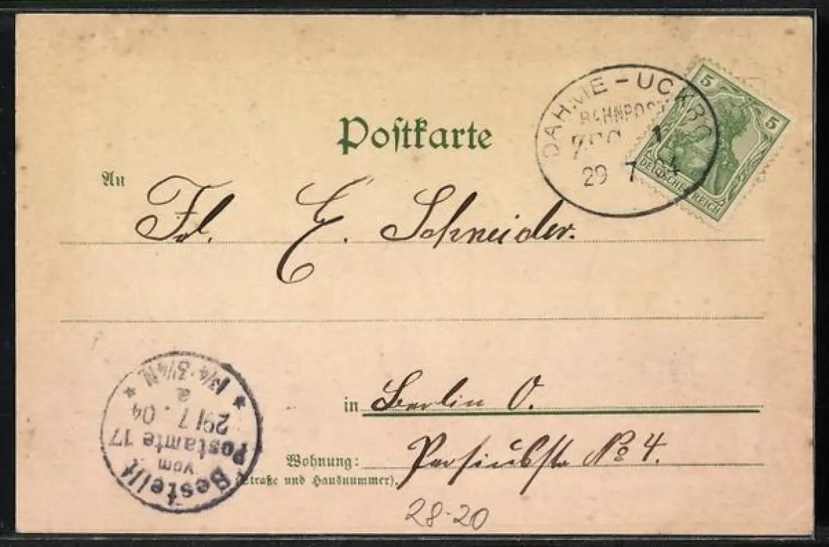 Personenbezogene Daten auf der Rückseite der Karte wurden durch blauen Textmarker unkenntlich gemacht. Die blauen Stellen sind auf die Vorderseite durchgeweicht und wirken sich negativ auf das Postkartenfoto aus