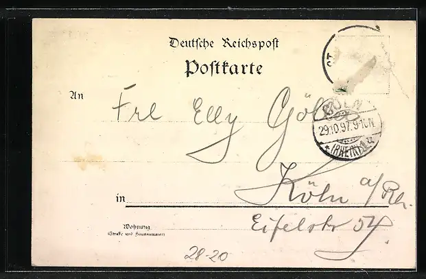 gelaufen 1897, Briefmarke entfernt, Bugspur li. oben, guter Zustand