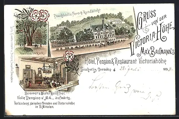 Lithographie Loschwitz /Dresden, Pension Victoria-Höhe v. Max Baumann mit Innenansicht, Parkpartie