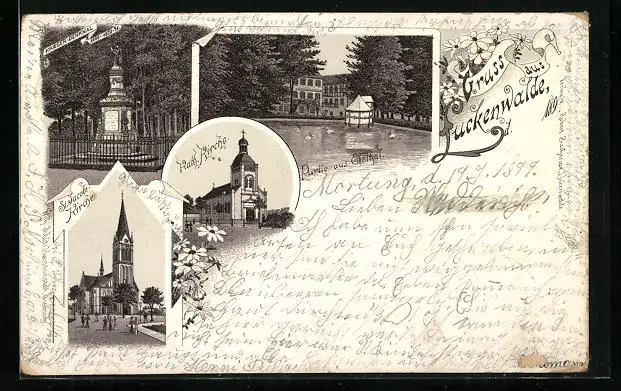 Lithographie Luckenwalde, Kirchen, Krieger-Denkmal, Partie aus Elsthal