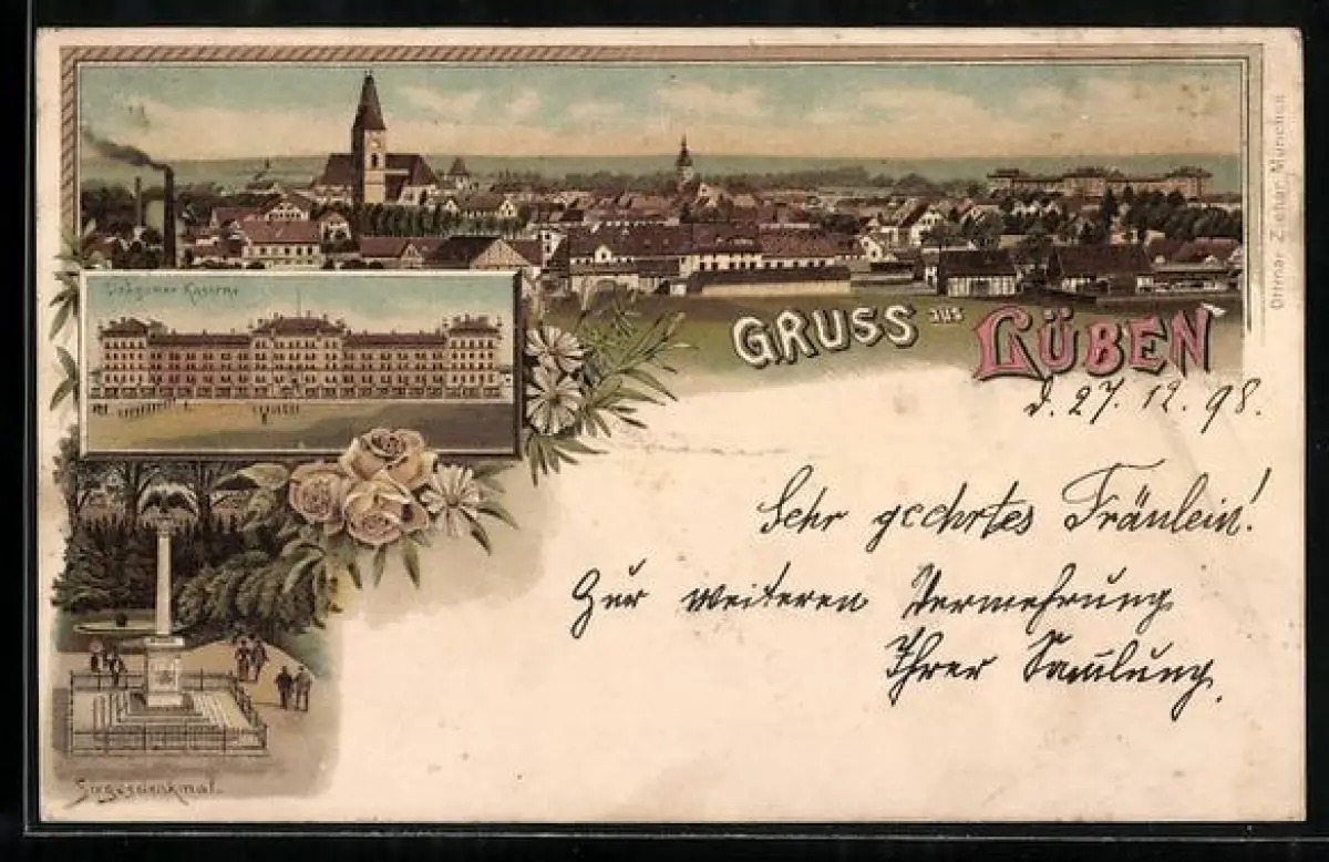 Lithographie Lüben, Totalansicht, Dragoner Kaserne und Siegesdenkmal