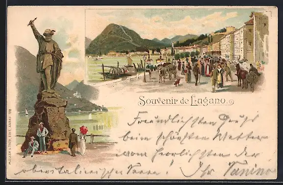 Lithographie Lugano, Ortspartie am See mit William Tell Statue