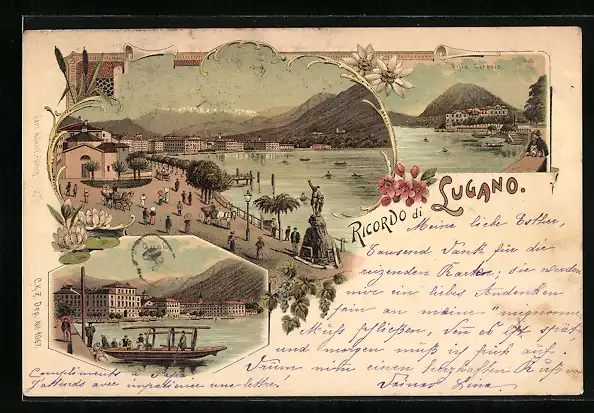 Lithographie Lugano, Quai, Villa Geresio, an der Promenade