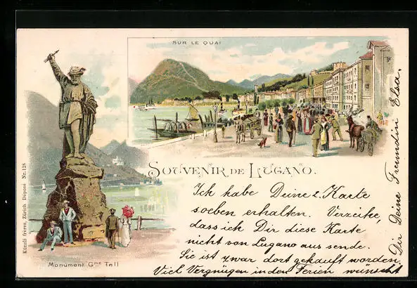 Lithographie Lugano, Sur le Quai, Monument Gme Tell