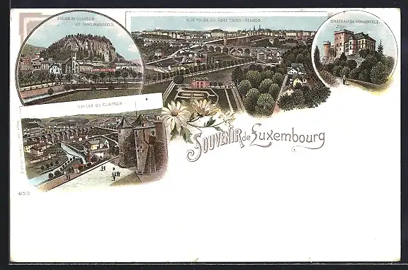 Lithographie Luxembourg, Clausen, Église et Parc Mansfeld, Chateau de Hohlenfelz, vue prise du Fort Trois-Glands