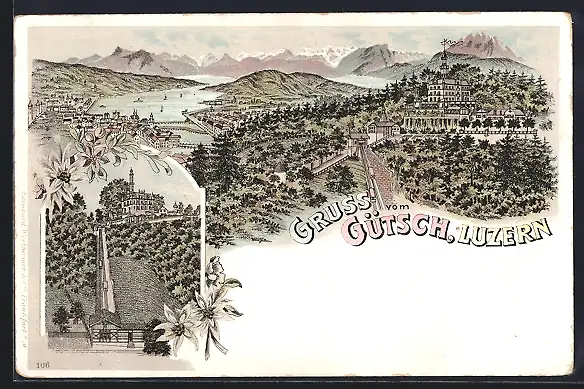 Lithographie Luzern, Gütsch, Ortspartie mit Gasthaus und Stadtansicht, Bergbahn