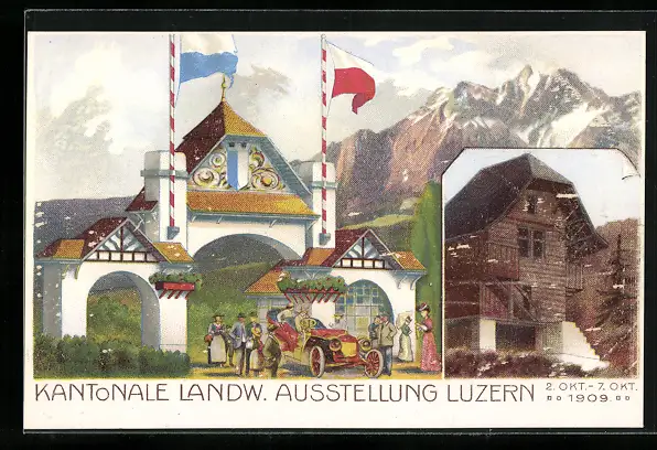 Lithographie Luzern, Kant. Landw. Ausstellung 1909, Auto fährt durch einen Torbogen des Ausstellungsgeländes