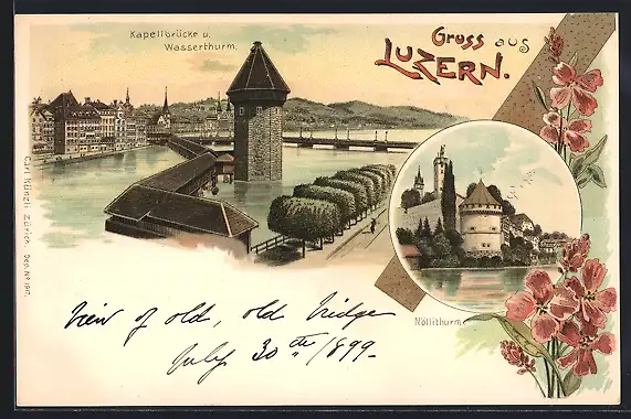 Lithographie Luzern, Kapellbrücke und Wasserthurm, Nöllithurm