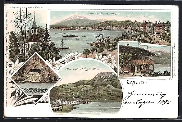 Lithographie Luzern, Ortsansicht mit Pilatus, Tellkapelle i. d. hohlen Gasse, Löwendenkmal, Küssnacht mit Rigi