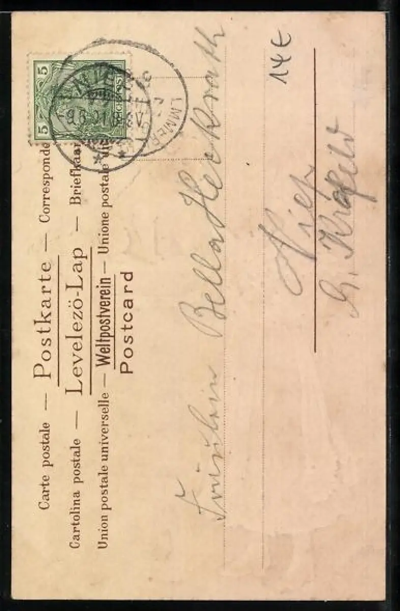 Personenbezogene Daten auf der Rückseite der Karte wurden durch blauen Textmarker unkenntlich gemacht. Die blauen Stellen sind auf die Vorderseite durchgeweicht und wirken sich negativ auf das Postkartenfoto aus
