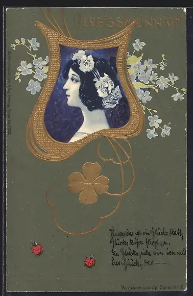 Lithographie Mädchenprofil in Zierrahmen, Klee und Vergissmeinnicht, Jugendstil