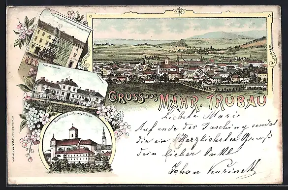 Lithographie Mähr. Trübau, Krankenhaus, Franz Josef-Springbrunnen und Postgebäude, Pfarrkirche und Pfarreigebäude
