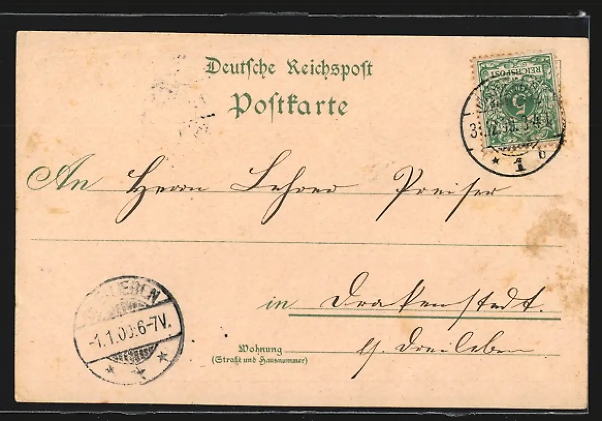 Personenbezogene Daten auf der Rückseite der Karte wurden durch blauen Textmarker unkenntlich gemacht. Die blauen Stellen sind auf die Vorderseite durchgeweicht und wirken sich negativ auf das Postkartenfoto aus