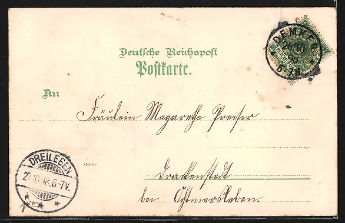 Personenbezogene Daten auf der Rückseite der Karte wurden durch blauen Textmarker unkenntlich gemacht. Die blauen Stellen sind auf die Vorderseite durchgeweicht und wirken sich negativ auf das Postkartenfoto aus