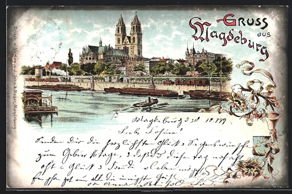 Lithographie Magdeburg, Dom, Elbufer, Stadtansicht
