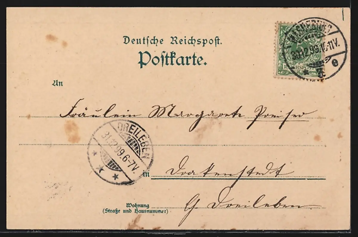 Personenbezogene Daten auf der Rückseite der Karte wurden durch blauen Textmarker unkenntlich gemacht. Die blauen Stellen sind auf die Vorderseite durchgeweicht und wirken sich negativ auf das Postkartenfoto aus