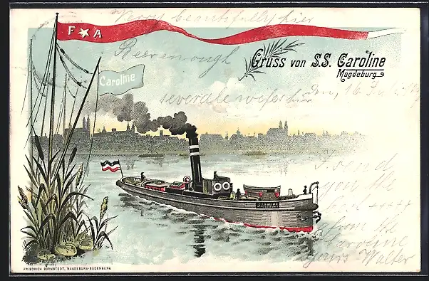 Lithographie Magdeburg, Elbdampfer SS Caroline vor der Silhouette der Stadt