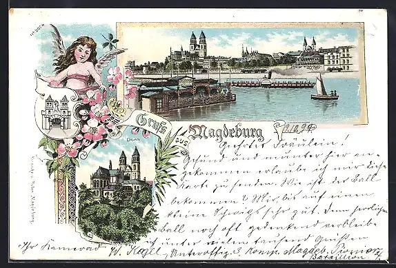 Lithographie Magdeburg, Uferpartie mit Dom, Englein hält Wappen