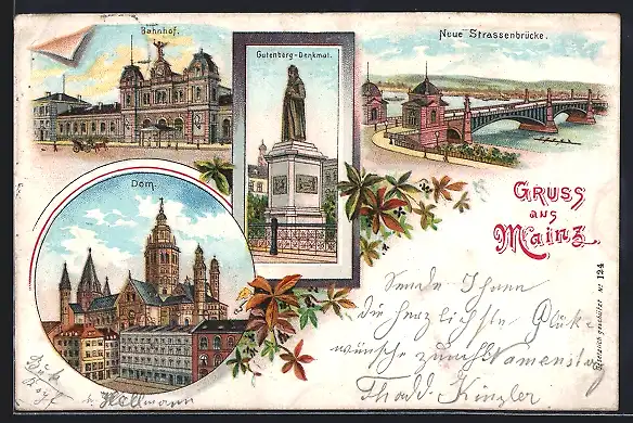 Lithographie Mainz, Bahnhof, Dom, Gutenberg-Denkmal und Neue Strassenbrücke
