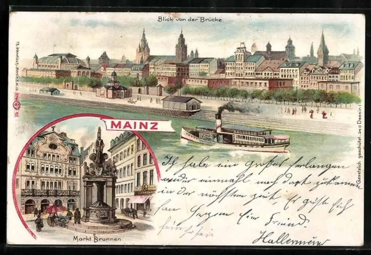 Lithographie Mainz, Blick von der Brücke, Markt Brunnen, Fahrrad-Fahrer
