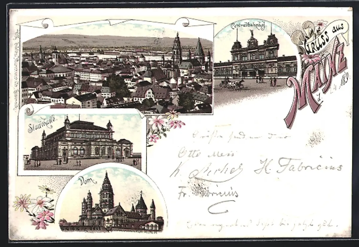 Lithographie Mainz, Centralbahnhof, Stadthaus, Teilansicht, Dom