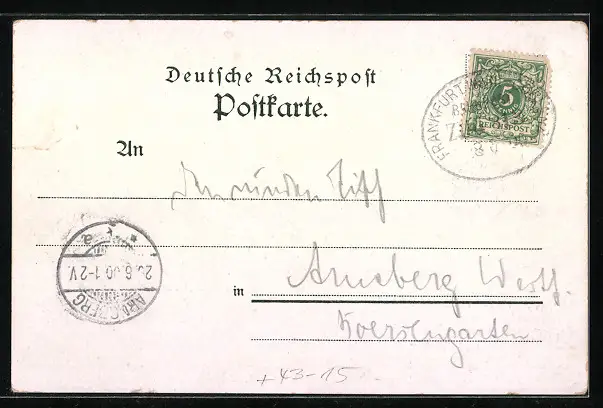 Personenbezogene Daten auf der Rückseite der Karte wurden durch blauen Textmarker unkenntlich gemacht. Die blauen Stellen sind auf die Vorderseite durchgeweicht und wirken sich negativ auf das Postkartenfoto aus