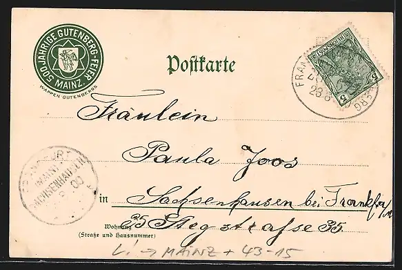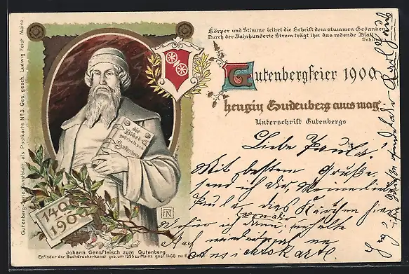Lithographie Mainz, Gutenbergfeier 1900, Johann Gensfleisch zum Gutenberg, 1395-1468