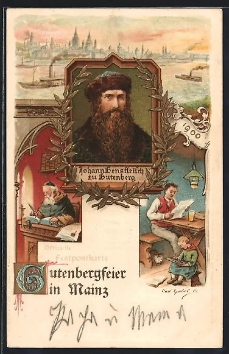 Lithographie Mainz, Gutenbergfeier 1900, Porträt Johann Gutenberg, Druckerwerkstatt, Stadtansicht