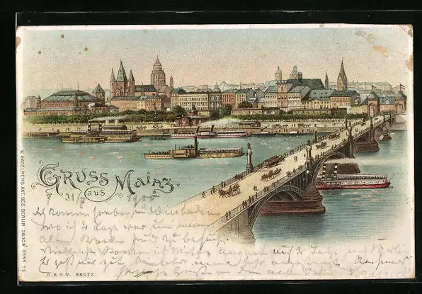 Lithographie Mainz, Panorama der Stadt mit Brücke und Rheindampfern