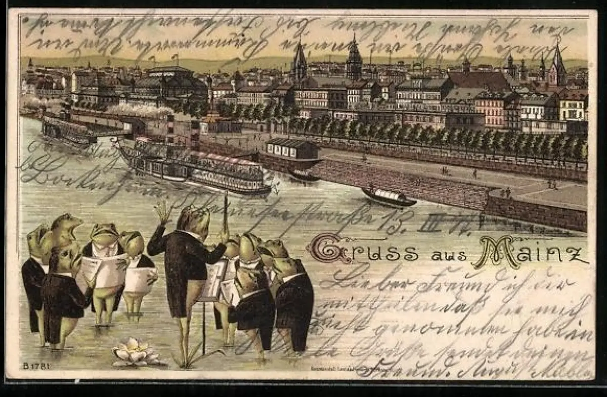 Lithographie Mainz, Rheinansicht mit Dampfschiff, Froschchor