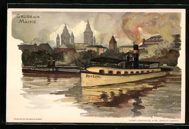 Lithographie Mainz, Teilansicht mit Dampfer Rhein