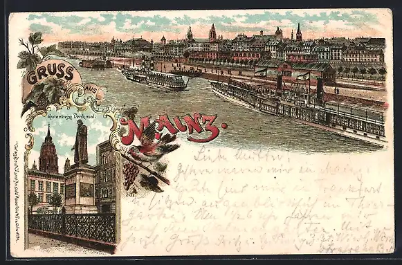 Lithographie Mainz, Totalansicht, Gutenberg-Denkmal