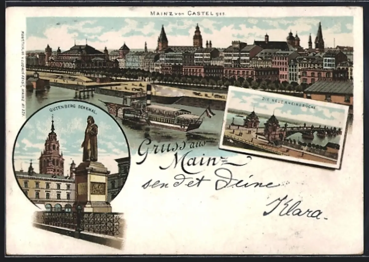 Lithographie Mainz, Totalansicht vom Castel aus, Gutenberg Denkmal, neue Rheinbrücke