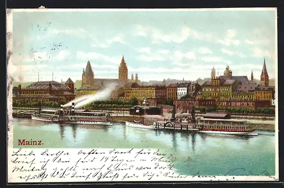 Lithographie Mainz, Uferpartie mit Kirche und Dampfern