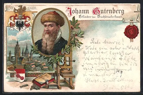 Lithographie Mainz, Zur Erinnerung an die fünfhundertjährige Gutenberg-Jubelfeier, 1400-1900, Ortspartie, Portrait