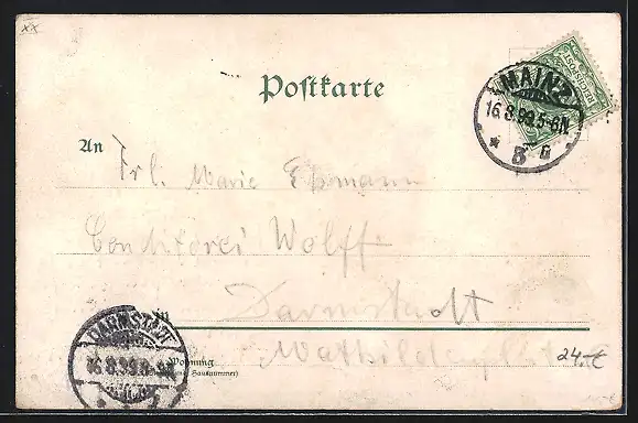 Personenbezogene Daten auf der Rückseite der Karte wurden durch blauen Textmarker unkenntlich gemacht. Die blauen Stellen sind auf die Vorderseite durchgeweicht und wirken sich negativ auf das Postkartenfoto aus