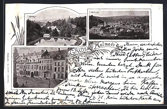 Lithographie Malmedy, Teilansicht, Montlujon, Marktplatz