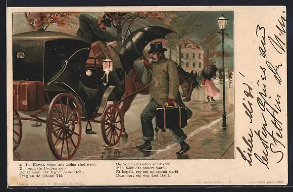 Lithographie Mann steigt bei Regen in eine Kutsche ein