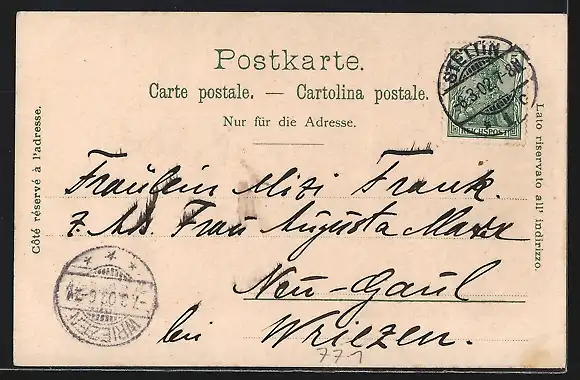 Personenbezogene Daten auf der Rückseite der Karte wurden durch blauen Textmarker unkenntlich gemacht. Die blauen Stellen sind auf die Vorderseite durchgeweicht und wirken sich negativ auf das Postkartenfoto aus