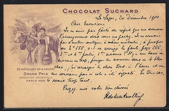 Lithographie Mann und Frau mit ihrer Milchkuh in den Bergen, Chocolat Suchard