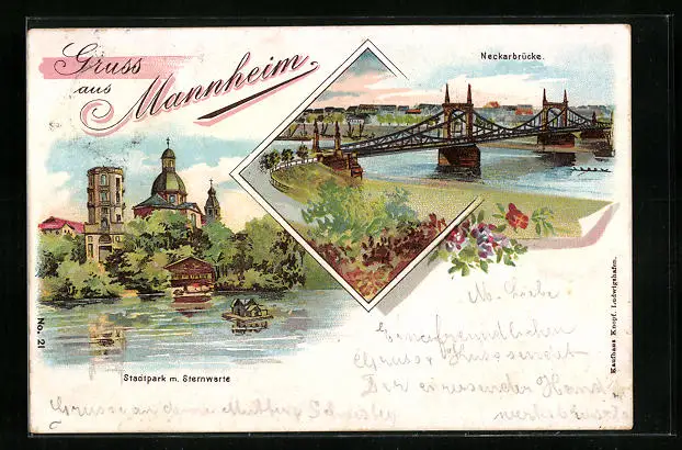 Lithographie Mannheim, Stadtpark mit Sternwarte, Neckarbrücke