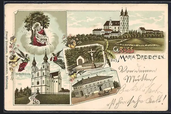 Lithographie Maria Dreieichen, Wallfahrtskirche, Gasthof Wacheihofer, Bründl