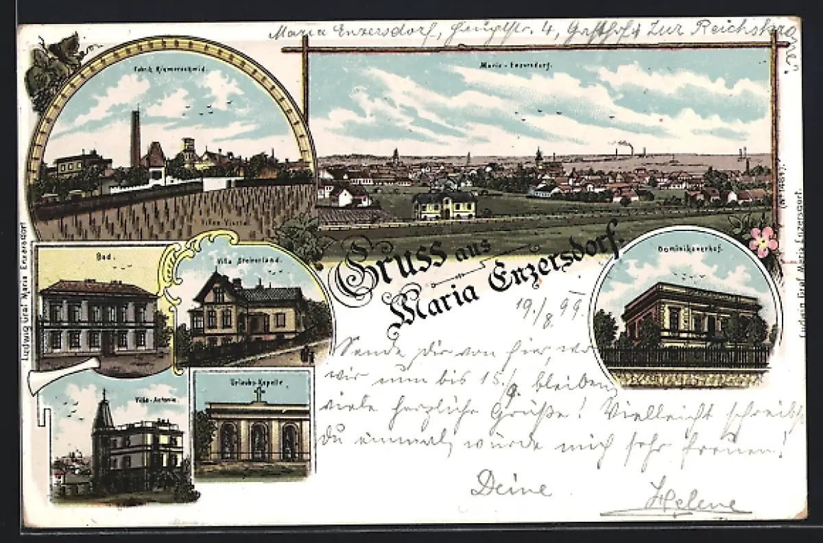 Lithographie Maria Enzersdorf, Villa Steirerland, Urlaubs-Kapelle, Fabrik Riemerschmid und Dominikanerhof