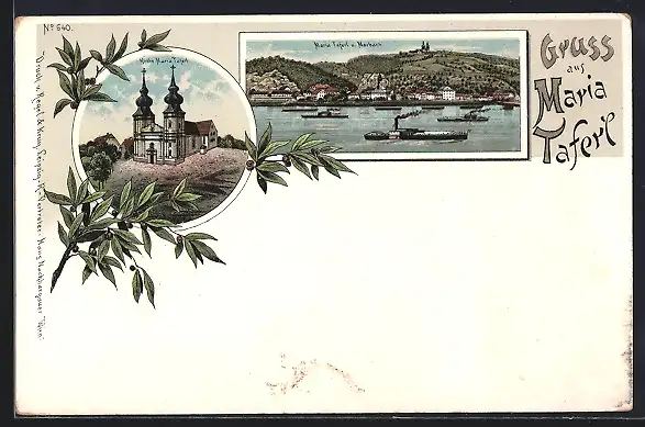 Lithographie Maria Taferl, Teilansicht mit Marbach, Kirche Maria Taferl
