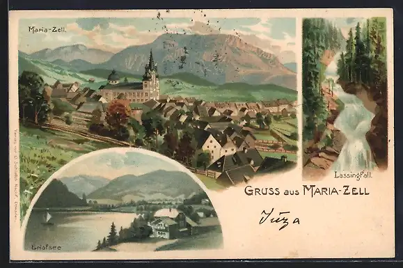 Lithographie Maria Zell, Panoramaansicht, Lassingfall, Erlafsee