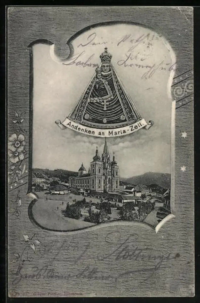 Lithographie Maria-Zell, Strassenpartie mit Kirche, Gnadenbild, Passepartout