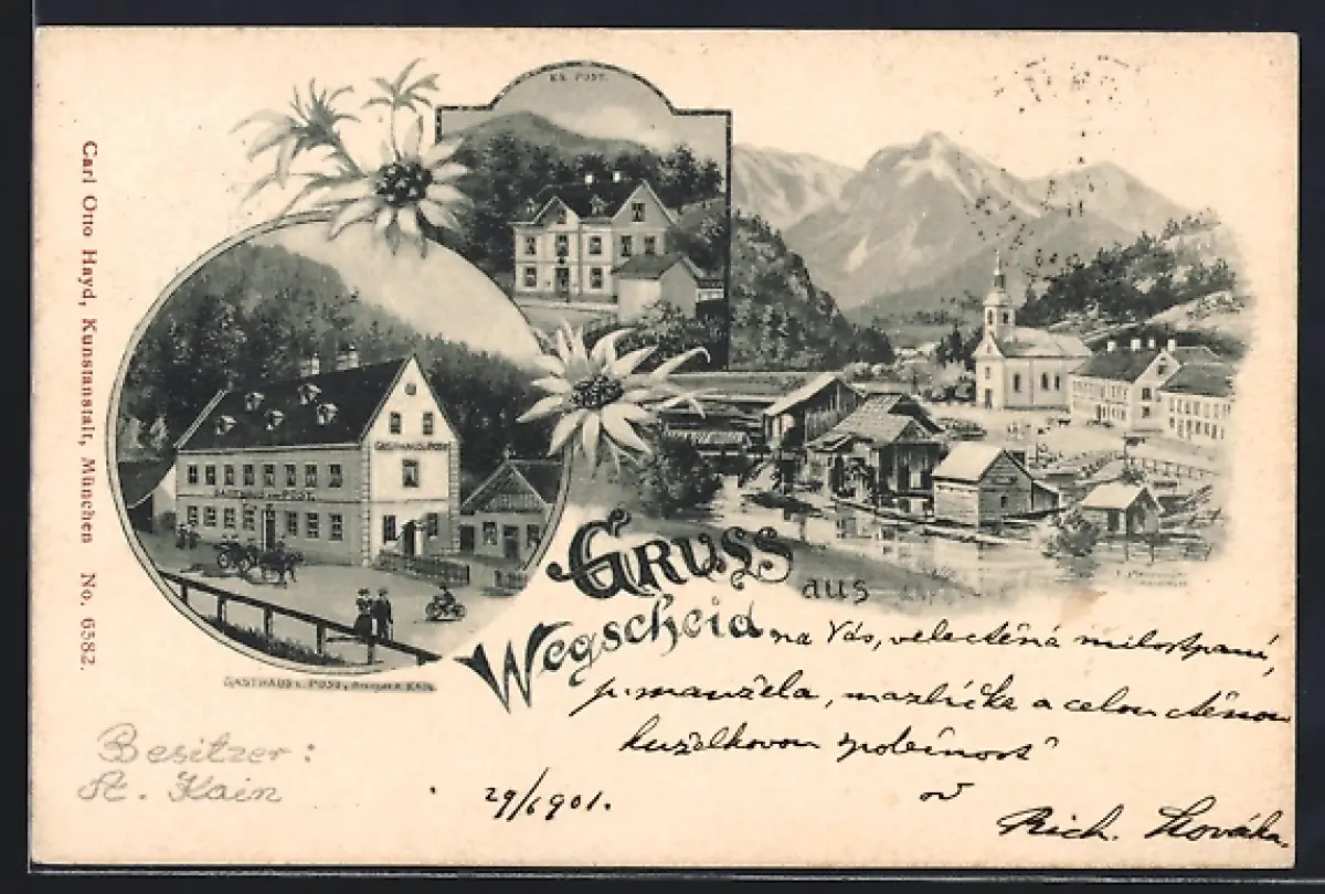 Lithographie Mariazell, Gruss aus Wegscheid, Gasthaus z. Post, Bes. A. Kain, Post, Ortsansicht
