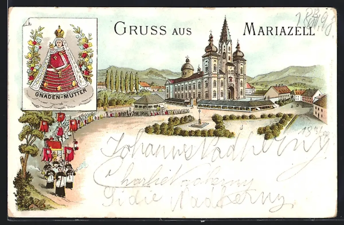 Lithographie Mariazell, Ortsansicht, Prozessionszug, Gnaden-Mutter