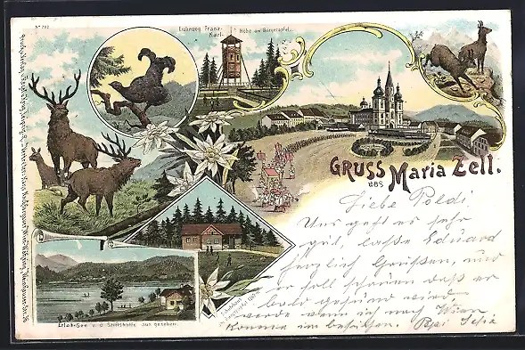 Lithographie Mariazell, Wahlfahrtskirche, Höhe am Bürgerapfel, Schutzhaus, Rothirsch, Birkhuhn