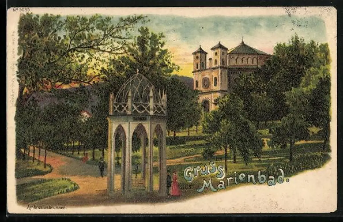 Lithographie Marienbad, Ambrosiusbrunnen mit Park